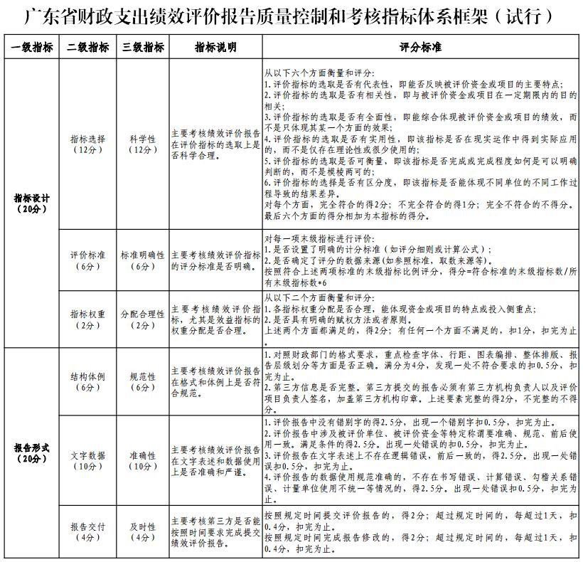 为加强第三方绩效评价管理,保证第三方绩效评价报告的质量,提高第三方绩效评价的公正性、客观性和公信力,近日,广东省财政厅印发《广东省财政支出绩效评价报告质量控制和考核指标体系框架(试行)》,设定三级考核指标,对第三方绩效评价报告进行质量考核。
