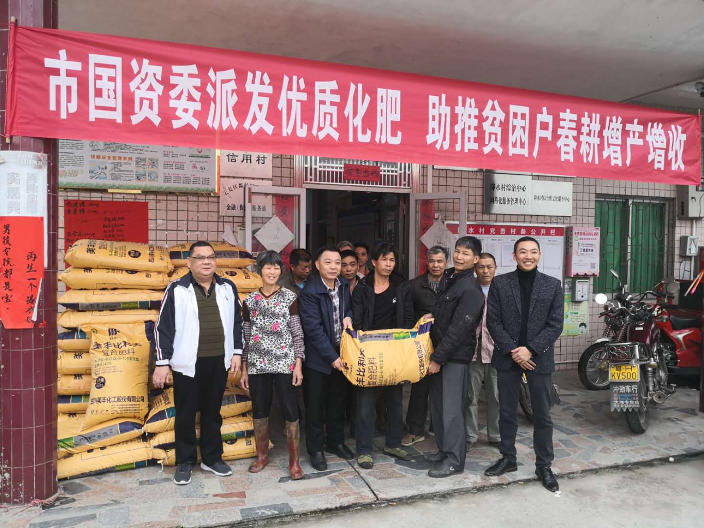 下午4时,陈主任一行首先来到降水村委门口,参加出席了“市国资委派发优质化肥”活动。期间,陈晓周同志与到来领取化肥的贫困户进行亲切交流,嘘寒问暖,并鼓励乡亲们要“撸起袖子加油干”,争取春耕增产增收。
