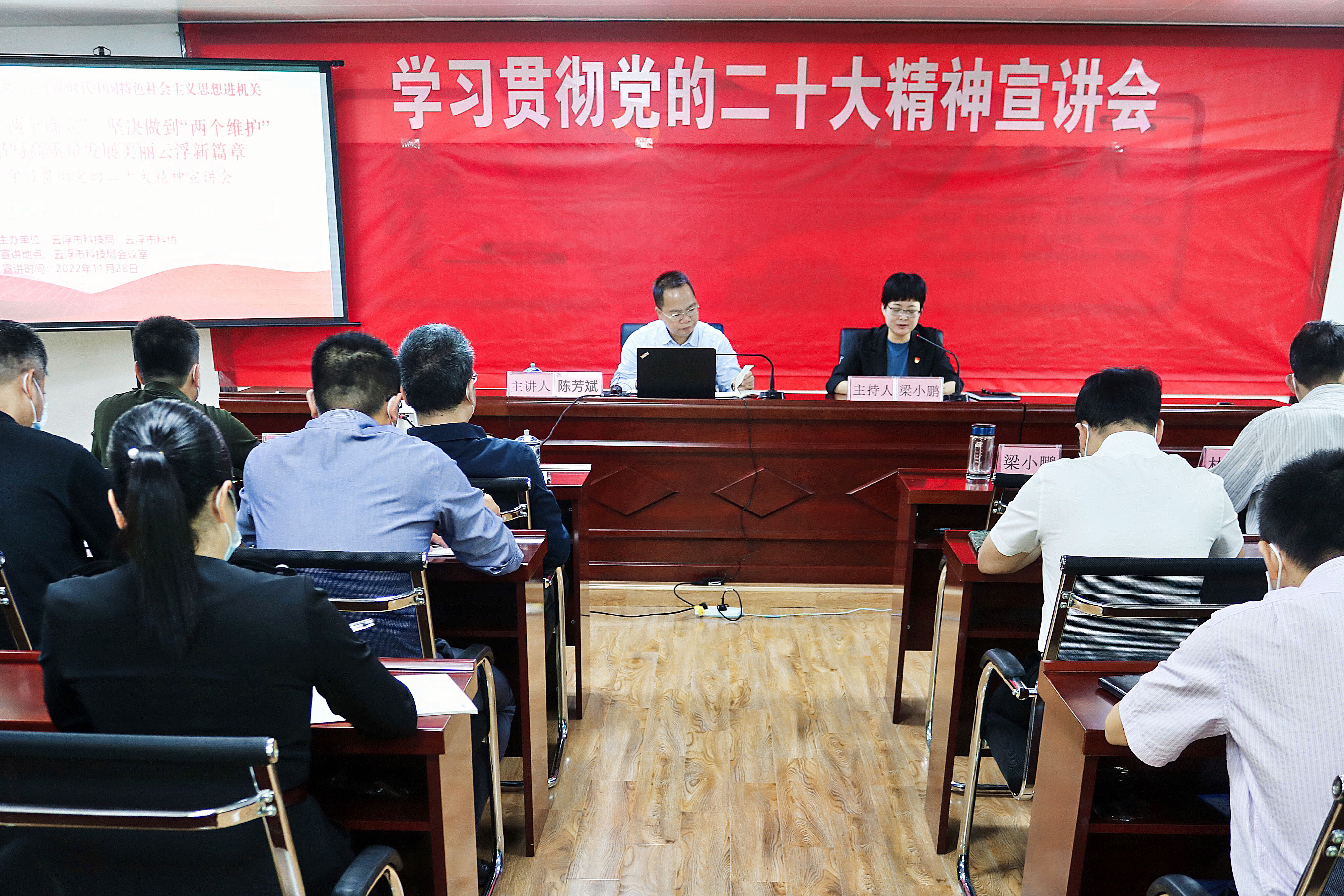 宣讲会上,陈芳斌以《忠诚拥护“两个确立”坚决做到“两个维护”,奋力书写高质量发展美丽云浮新篇章》主题,围绕党的二十大的主题和主要成果、过去5年的工作和新时代10年的伟大变革、马克思主义中国化时代化、中国式现代化、全面建设社会主义现代化国家的目标任务、坚持党的全面领导和全面从严治党、应对风险挑战等七个方面,对党的二十大精神进行了集中阐释和系统讲解。授课主题鲜明、内容丰富、讲述生动,为全体党员干部深入读原著、学原文、悟原理,全面理解和准确把握党的二十大精神提供了理论启示和实践指导。