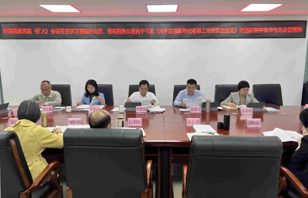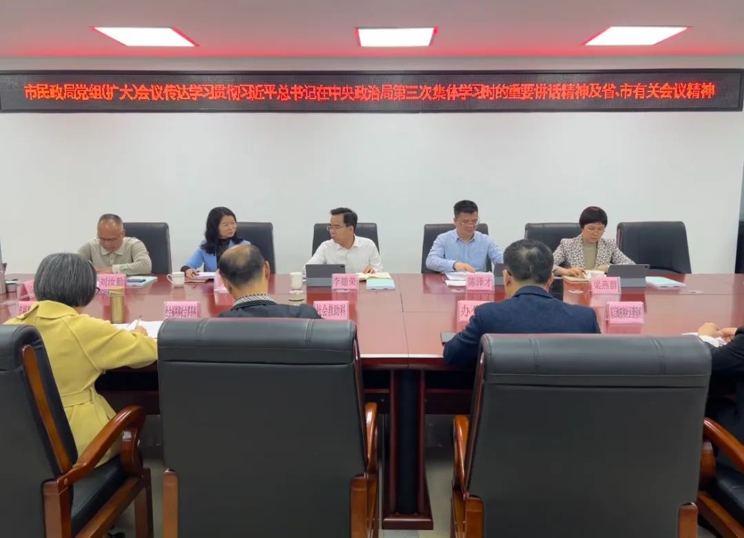 2023年4月2日,云浮市民政局召开党组(扩大)会议,传达学习贯彻习近平总书记在中央政治局第三次集体学习时的重要讲话精神和《关于加强新时代老龄工作的实施意见》《云浮市实施“百千万工程”近期重点工作清单》等通知文件精神和省、市有关疫情防控、防汛工作等文件精神。市民政局党组书记、局长李德荣主持会议并讲话,局党组成员出席会议;三、四级调研员,各科室和下属事业单位负责人,驻市财政局纪检监察组组长刘汝勤列席会议。