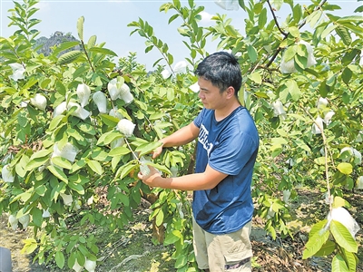 在龙光石榴场,最吸引人眼球的,除了挂满枝头的番石榴,就数环绕整个石榴场的水渠了。水渠从附近的泉眼引出,将清澈的泉水输送到每一块石榴地。和记者一道前来的苹塘镇相关负责人介绍,苹塘镇是典型的喀斯特地貌,没有江河,但很多地方都有清澈甘甜的泉水从地下涌出来,当地村民用于饮用、洗衣和种植等等。其中,用泉水种植稻米、蔬菜、水果等作物是苹塘镇的一大特色,所产出的产品口感特别,天然无污染,深受市场欢迎。石榴场老板龙叔介绍,他们一家在这里经营石榴场已经6年了,石榴场从当初的10多亩发展到现在的40多亩,销售市场也从罗定本地扩展到珠三角地区。随着规模不断扩大,果场需要的人手越来越多,带动了周边村民就业。“过去果场规模小,自家人就可以打理好。现在忙不过来了,我们就聘请了七八位村民帮忙打理,他们也可以增加收入。”龙叔对记者说。