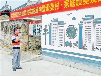 在思劳镇城村,记者发现,村道平整干净,许多楼房墙体和灯笼上描绘有“中国梦”、村规民约等相关的标语和图画。走进村内,映入眼帘的是两口碧绿的池塘,塘中锦鲤生猛活泼,所到之处移步异景。“这些年城村发展不断加快,修建环村道、升级池塘景观、拆除旧房猪舍,一项项工程的不断推进使得生态环境逐步优美,公共服务设施不断完善,更重要的是村民的意识也随之不断提升。”城村支部书记陈景湛告诉记者,乡村富美少不了风气文明,要说城村为何能有如今景象,一方面是因为大家都尝到了齐心共建家园的甜头,另一方面制定的村规民约起到了大作用,有了规范的条例,村民自我约束意识逐渐形成,在两者的影响下把乡村好风气撑了起来。