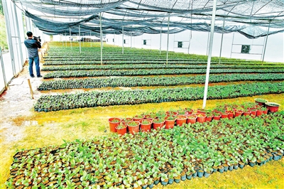 佰和明公司相关负责人介绍,公司计划在山家村建设了一个以生态中草药养生体验为主题,集文化展示、休闲观光、科普体验、教育科研、主题度假于一体的中草药养生休闲生态园,其中南药种植占重要地位。生态园规划占地面积约1100亩,其中种植面积约1000多亩,搭设育苗大棚30000平方米。目前生态园建设正在进行中,已经种植猴耳环、黑老虎、山豆根等品种700多亩,上述南药品种的种苗正在繁育的有100多万株。种苗繁育是基地发挥辐射带动作用的重要一环。