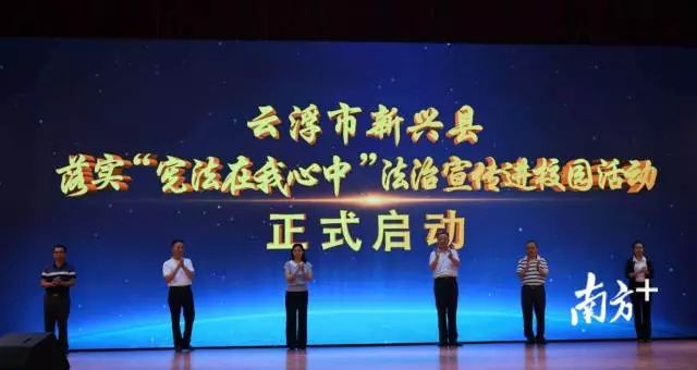 5月29日下午,新兴县落实“宪法在我心中”法治宣传进校园活动启动仪式暨“宪法教育大课堂”公开课在新兴县实验中学举行,该校逾1200名师生和家长代表参加公开课。云浮市司法局副局长林庆洲、新兴县副县长梁志莲,县司法局局长曾志斌以及县教育局、县妇联、团县委等县直相关单位负责人,县直属学校、各镇中心校校长,各镇分管领导,各镇司法所负责人、一校一法律顾问参加启动仪式并现场观摩。