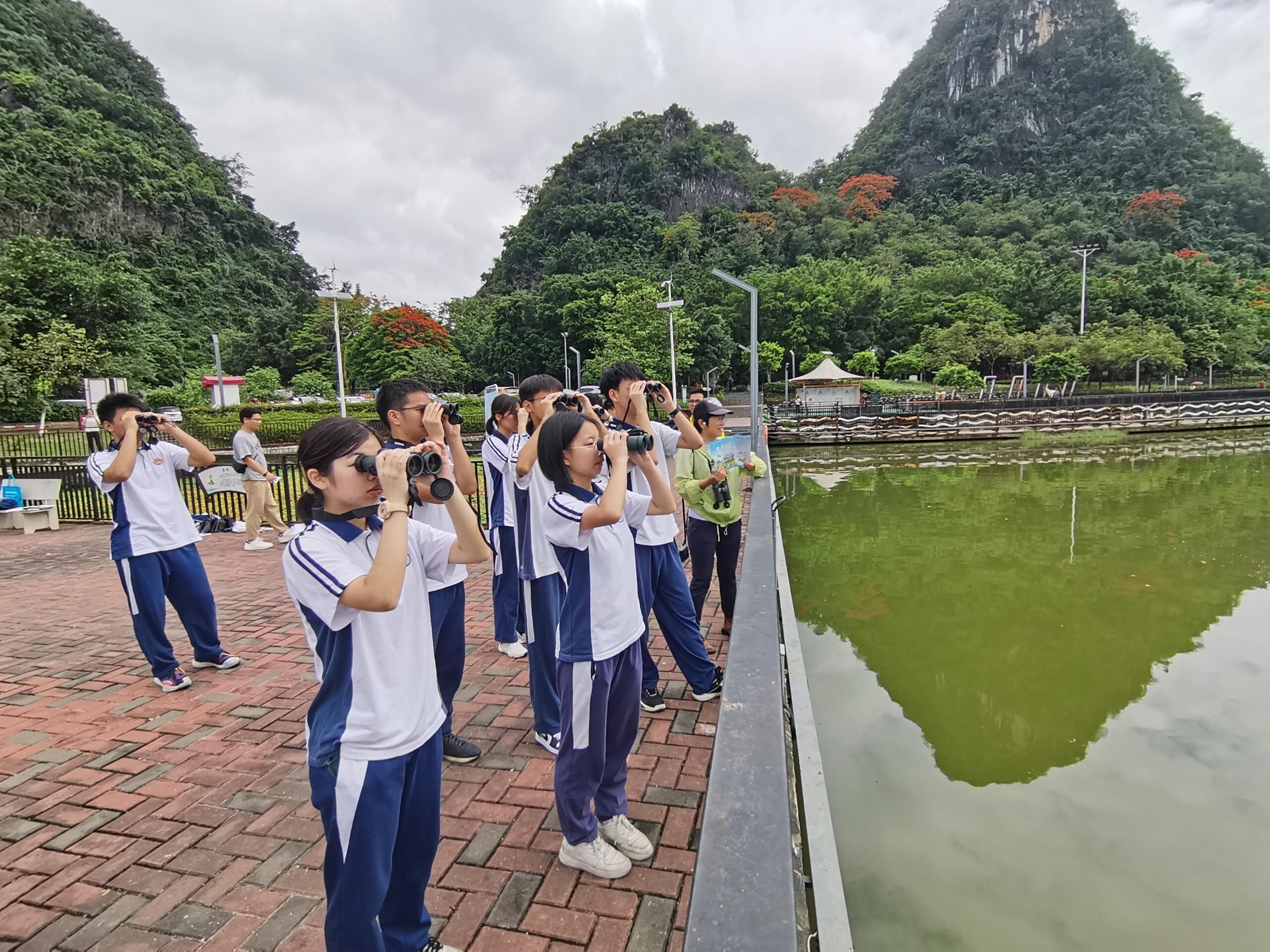 ▲图为科普老师带领学生开展“观鸟”研学实践活动