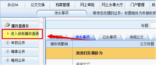 通过登录云浮市电子政务系统,点击“进入新版廉政直通车”菜单即可登录到廉政直通车信息管理平台,如下图: