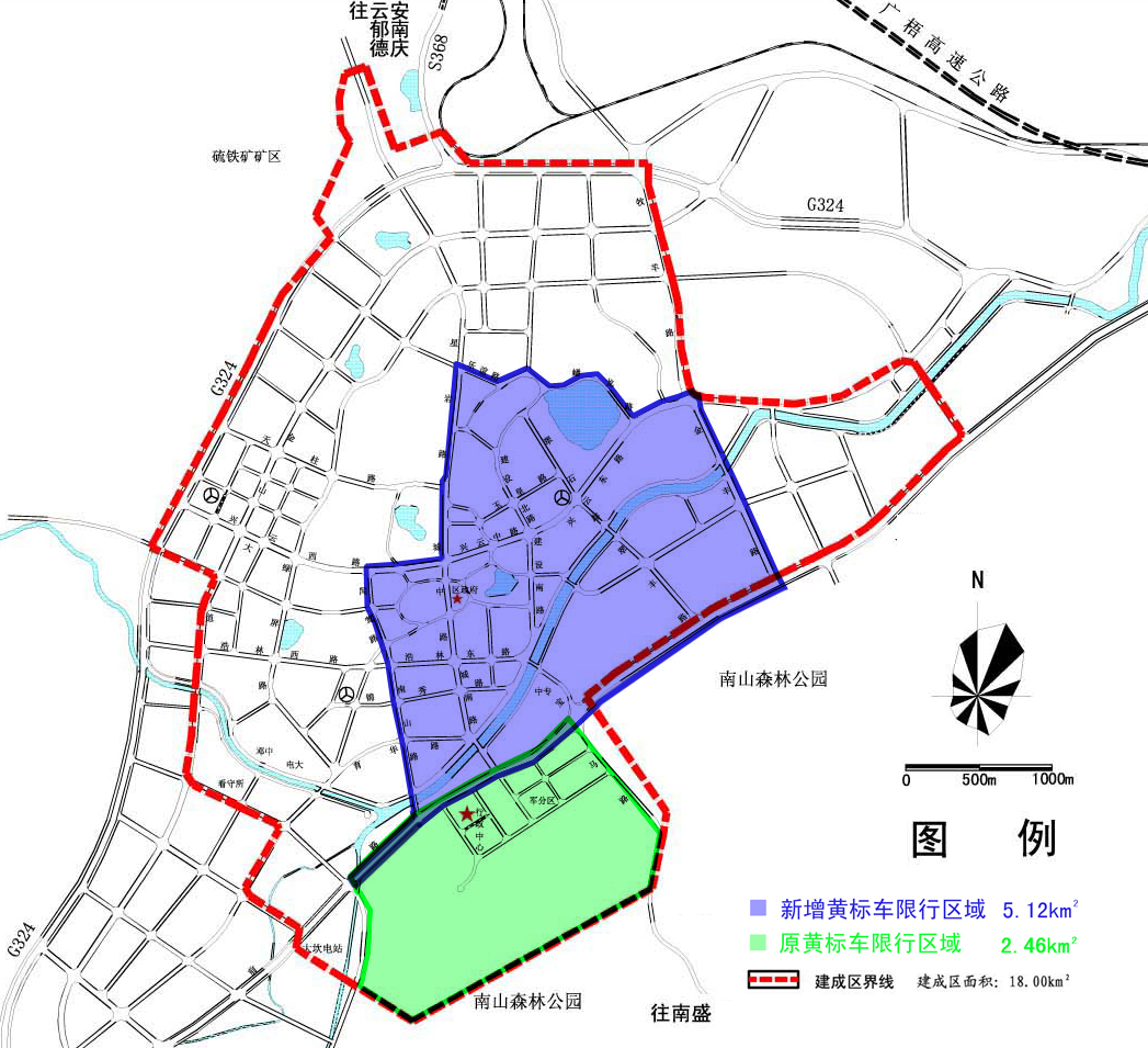 在原限行区域(2.46km2)的基础上扩大限行区域面积,新增区域面积5.12km2,合计面积7.58km2,占建成区总面积42.1%。新增区域:市城区新世纪大道中富民路路口(三河洲住宅区)——新世纪大道东金丰路路口(中石化加油站)——金丰路兴云东路路口(金龙桥)——兴云东路蟠龙路路口(区人民医院春岗分院)——蟠龙路——珊瑚路——乐谊路星岩三路路口(中石化加油站)——星岩二路——城中路兴云西路路口(购物中心)——兴云西路闻莺路路口(田家炳中学)——闻莺路——南山路——新世纪大道中富民路路口(三河洲住宅区)。上述路段围合区域内所有路段(含上述路段)禁止“黄标车”通行。