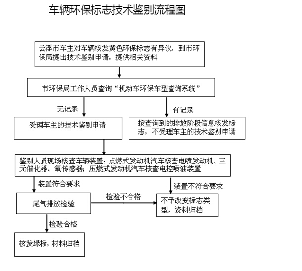 对在云浮市登记并在机动车环保车型查询系统(//www.vecc-mep.org.cn)无法查询的车型,车主对按机动车注册登记时间核发黄色环保标志有异议的车辆,可根据《广东省环境保护厅关于机动车环保标志技术鉴别的规范》要求,向云浮市环境保护局申请技术鉴别。经技术鉴别合格的车辆可核发绿色环保检验合格标志。