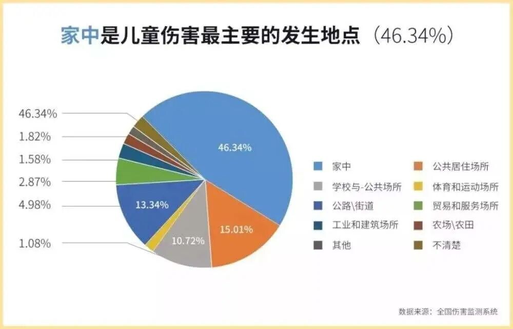 家里是儿童伤害最主要的发生地。《中国青少年儿童伤害现状回顾报告》指出,发生伤害的地点,主要集中在家里。居家安全是不容忽视的重要环节。儿童年龄越小,越需要成人的看护;成人看护越有效,儿童发生伤害的可能性越低。