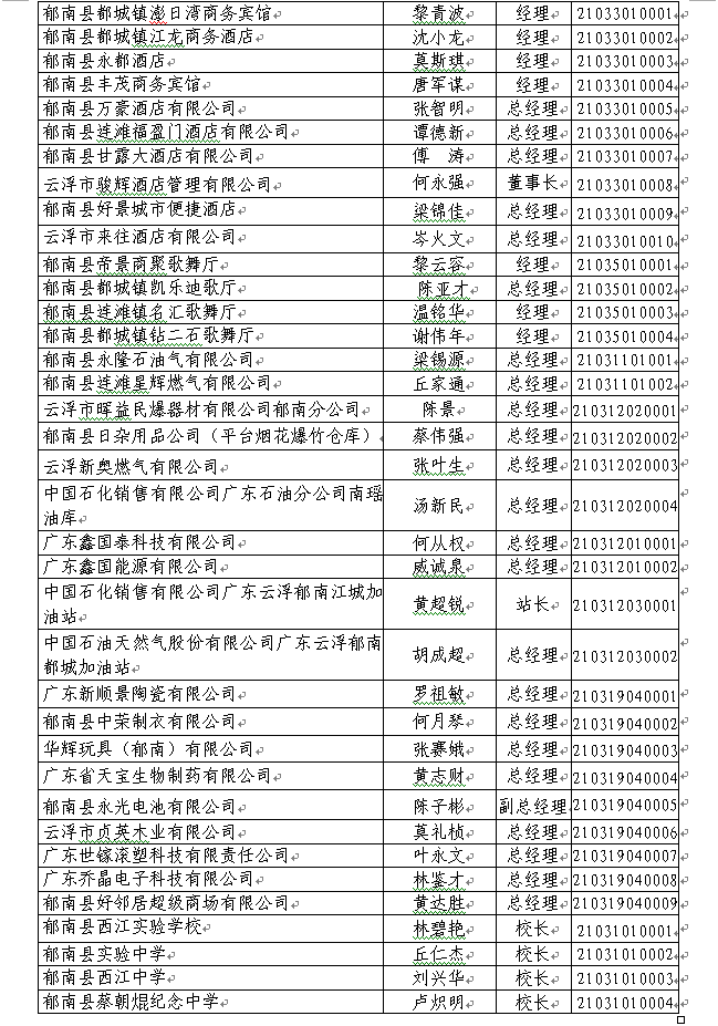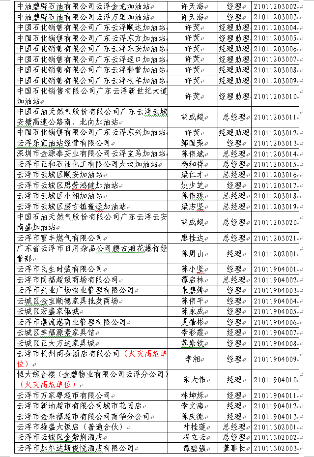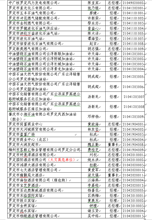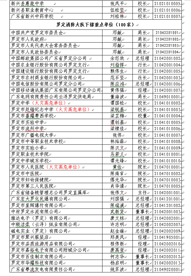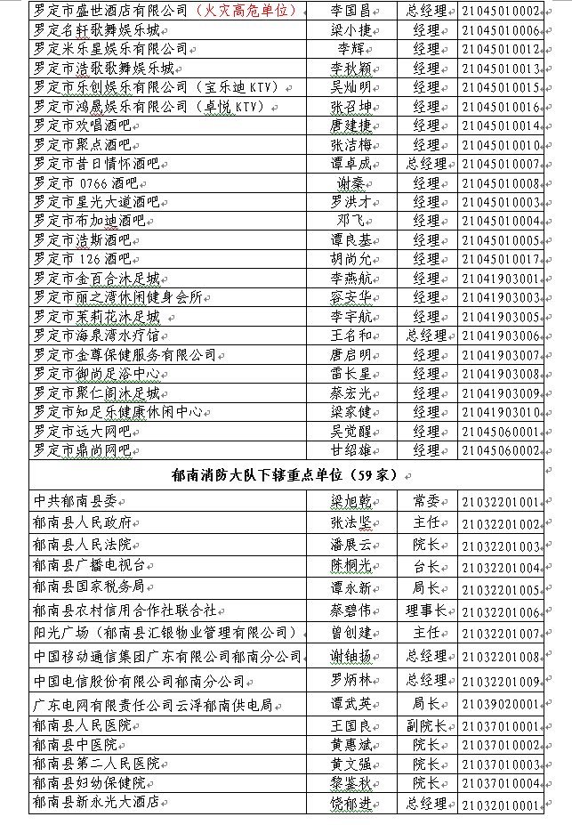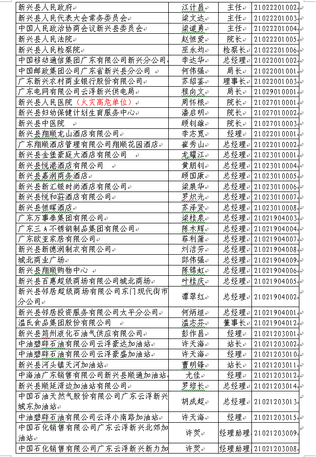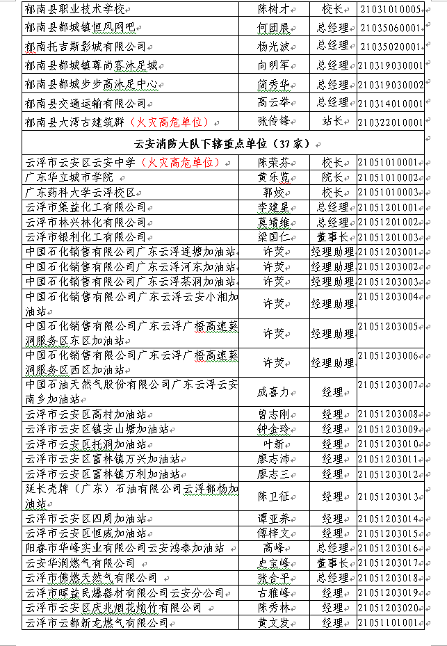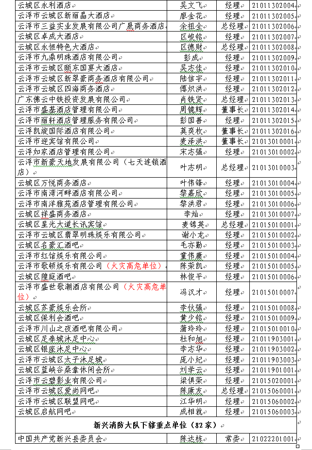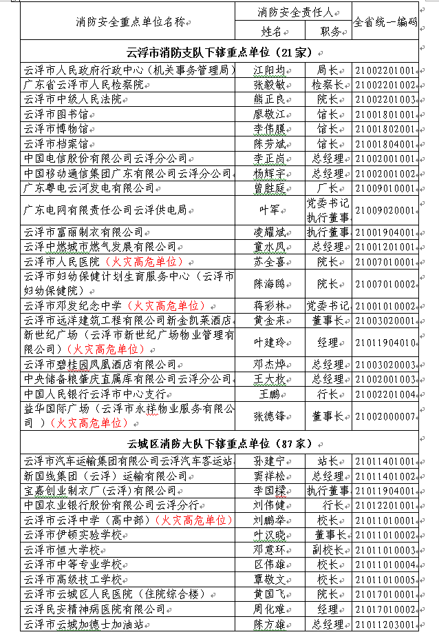 根据《中华人民共和国消防法》、《广东省消防安全重点单位管理规定》(粤办函〔2016〕96号)、《广东省火灾高危单位消防安全管理规定》(粤府办〔2014〕10号)的规定和《关于印发广东省消防安全重点单位消防监督管理工作细则的通知》(粤公通字〔2017〕22号),以下386家单位被确定为云浮市2019年消防安全重点单位,其中19家单位为火灾高危单位。各单位的法定代表人为本单位消防安全第一责任人。各单位要严格遵守消防法律法规,落实消防安全责任制,自觉履行《中华人民共和国消防法》和《机关、团体、企业、事业单位消防安全管理规定》(公安部61号令)赋予的各项职责,做好消防安全管理工作。