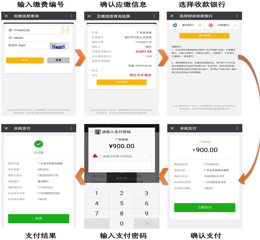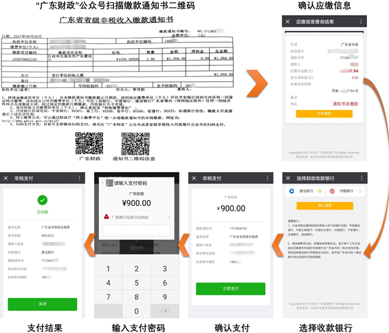 在前期开通省级财政网上缴费平台、实现网上缴纳省级非税的基础上,省财政厅依托“广东财政”公众号和省级财政网上缴费平台,开通了微信缴款渠道,缴款人可以直接通过微信实现便捷支付。具体方法为:关注“广东财政”公众号,在菜单栏选择“非税服务-非税缴费”进入业务办理页面,输入缴款通知书编号等信息并自主选择非税收入代收银行后,即可跳转微信支付页面进行便捷支付(如下图所示)。