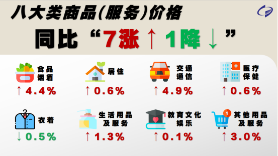 八大类商品及服务价格同比指数“7涨1降”。其中,交通通信价格上涨4.9%,食品烟酒价格上涨4.4%,其他用品及服务价格上涨3.0%,生活用品及服务价格上涨1.3%,居住价格上涨0.6%,医疗保健价格上涨0.6%,教育文化娱乐价格上涨0.1%,衣着价格下降0.5%。