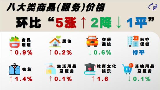 八大类商品及服务价格环比指数“5涨2降1平”。其中,教育文化娱乐价格上涨1.6%,衣着价格上涨1.4%,食品烟酒价格上涨0.9%,居住价格上涨0.2%,生活用品及服务价格上涨0.1%,医疗保健价格持平,交通通信价格下降0.6%,其他用品及服务价格下降0.1%。
