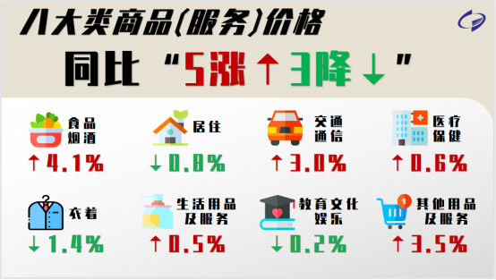 八大类商品及服务价格同比指数“5涨3降”。其中,食品烟酒价格上涨4.1%,其他用品及服务价格上涨3.5%,交通通信价格上涨3.0%,医疗保健价格上涨0.6%,生活用品及服务价格上涨0.5%,教育文化娱乐价格下降0.2%,居住价格下降0.8%,衣着价格下降1.4%。