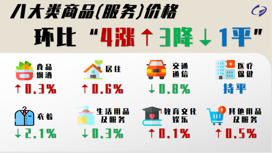 八大类商品及服务价格环比指数“4涨3降1平”。其中,居住价格上涨0.6%,其他用品及服务价格上涨0.5%,食品烟酒价格上涨0.3%,教育文化娱乐价格上涨0.1%,生活用品及服务价格下降0.3%,交通通信价格下降0.8%,衣着价格下降2.1%,医疗保健价格持平。