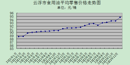 12月份,我市食用油市场供应充足,价格微幅上升,总体保持稳中有升。监测的9种食用油5L桶装零售均价每桶为94.71元,与上月环比升1.03%,与去年同期比升3.36%。