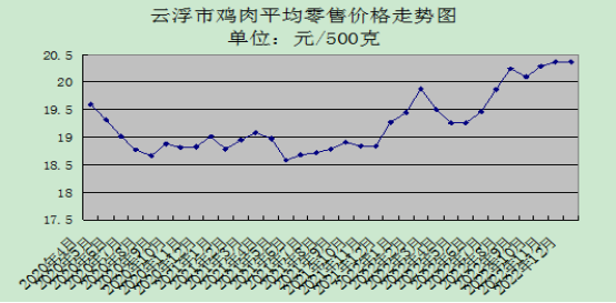 12月份,我市鸡肉市场供应充足,价格微幅上升,总体保持稳中有升。鸡肉市场零售均价每500克为20.37元,与上月环比升0.05%,与去年同期比升5.76%。
