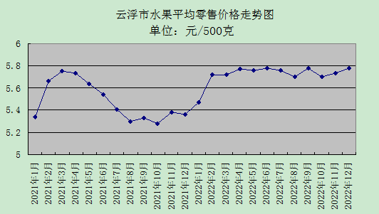 12月份,我市水果供应充足,价格微幅上涨,监测的6种主要水果零售均价每500克为5.78元,与上月环比升0.87%,与去年同期比升7.84%。