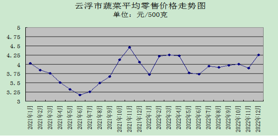 12月份,我市蔬菜供应充足,价格上升,所监测的30种蔬菜品种,零售均价每500克为4.25元,与上月环比升9.82%,与去年同期比升4.68%。