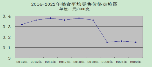 2022年,粮食市场价格总体平稳,全年粮食平均零售价每500克为3.15元,环比(与2021年比,下同)降0.32%。