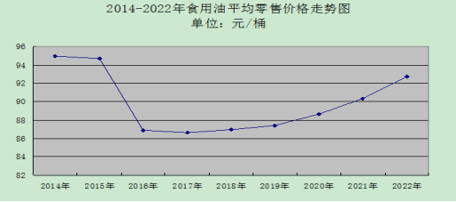 2022年,食用油市场供应正常,价格小幅上涨,9种油品平均零售价每桶(5L装)为92.77元,环比升2.69%。