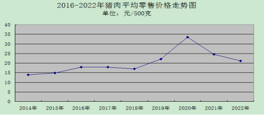 2022年,4种猪肉平均零售价每500克为21.13元,其中,排骨、瘦肉零售价每500克分别为32.54元、21.41元,环比降2.43%、18.93%。