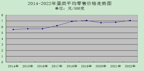 2022年,禽蛋市场供求平衡,价格上升,平均零售价每500克为7.07元,环比升4.28%。