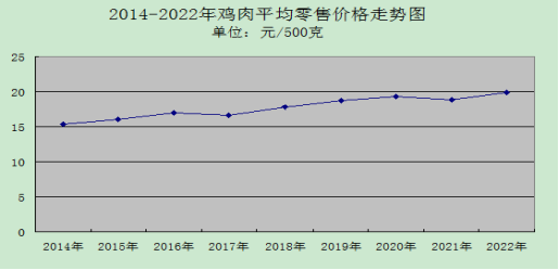 2022年,鸡肉价格小幅上行,平均零售价每500克为19.83元,环比升4.98%。