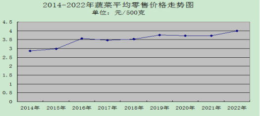 2022年,蔬菜供应充足,价格微幅上升,平均零售价每500克为3.99元,环比升6.97%。