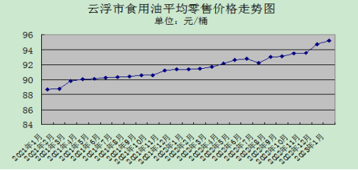 1月份,我市食用油市场供应充足,价格微幅上升,总体保持稳中有升。监测的9种食用油5L桶装零售均价每桶为95.48元,与上月环比升0.75%,与去年同期比升4.43%。