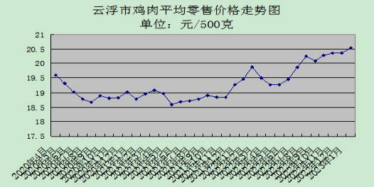 1月份,我市鸡肉市场供应充足,价格微幅上升,总体保持稳中有升。鸡肉市场零售均价每500克为20.53元,与上月环比升0.59%,与去年同期比升5.44%。