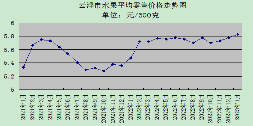 1月份,我市水果供应充足,价格微幅上涨,监测的6种主要水果零售均价每500克为5.83元,与上月环比升1.04%,与去年同期比升6.58%。