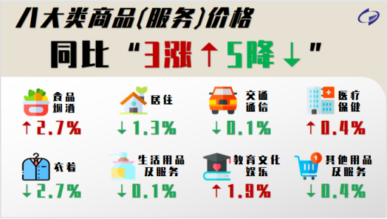 从同比看,CPI八大类商品(服务)价格“3涨5降”。其中,食品烟酒、教育文化娱乐和医疗保健价格分别上涨2.7%、1.9%和0.4%,衣着、居住、其他用品及服务、生活用品及服务和交通通信价格分别下降2.7%、1.3%、0.4%、0.1%和0.1%。