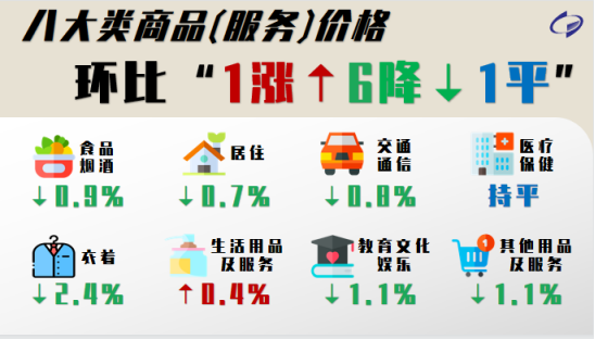 从环比看,CPI八大类商品(服务)价格“1涨6降1平”。其中,生活用品及服务上涨0.4%;医疗保健价格持平;衣着、教育文化娱乐、其他用品及服务、食品烟酒、交通通信、居住价格分别下降2.4%、1.1%、1.1%、0.9%、0.8%、0.7%。