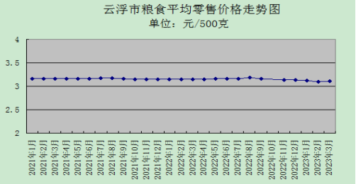 3月份,我市粮食市场供应充足,总体保持平稳运行。所监测的6种粮食市场零售均价每500克为3.11元,与上月环比持平,与去年同期比降1.27%。其中,丝苗米、珍珠米、标准粉、富强粉零售价环比(与2月比,下同)分别降0.62%、升0.64%、持平,持平;同比(与去年3月比,下同)降3.58%、升2.39%、降1.75%、升1.52%。