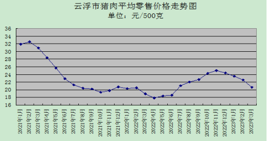 3月份,云浮市猪肉市场供应充裕,价格稳中有跌,所监测的4种猪肉品种每500克平均零售价为20.59元。其中,排骨、瘦肉、上肉、肋条肉零售价与上月环比分别降4.80%、7.61%、9.32%、10.64%,同比上升7.97%、4.91%、13.03%、10.34%。