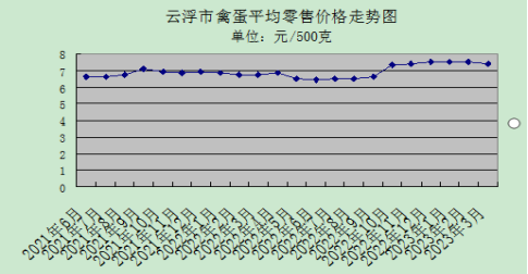 3月份,云浮市禽蛋市场供应充足,价格总体稳中有跌。4种禽蛋市场零售均价每500克为7.41元,与上月环比降1.07%,与去年同期比升9.62%,其中,白壳鸡蛋降1.87%,红壳鸡蛋降0.56%,鸭蛋降0.78%。
