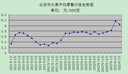 3月份,云浮市水果供应充足,价格微幅下跌,监测的6种主要水果零售均价每500克为6.05元,与上月环比降1.47%,与去年同期比升5.77%,其中,橙子降5.02%,苹果降3.43%,香蕉降2.85%。