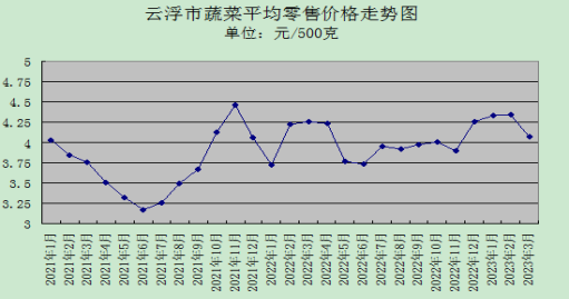蔬菜:3月份云浮市天气以阴间多云为主,全月雨量少,春天空气湿度大,光照足,蔬菜生产正常,市场蔬菜供应充足,蔬菜供应未受干旱天气影响,菜价微幅下降。预计4月份,清明、谷雨季节,雨水较多,天气不稳定,蔬菜生产或受影响,价格微幅上升的可能性大。