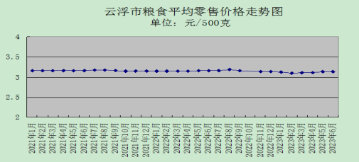 6月份,我市粮食市场供应充足,价格总体稳定。所监测的6种粮食市场零售均价每500克为3.14元,环比(与5月比,下同)持平,同比(与2022年6月比,下同)微降0.63%。其中,4种大米(晚籼米、丝苗米、珍珠米、油粘米)零售均价每500克分别为3.03元、3.26元、3.00元、3.25元,环比均持平,同比分别下降3.81%、下降2.69%、持平、下降1.81%;2种粉(标准粉、富强粉)零售均价每500克分别为2.82元、3.50元,环比分别上升0.36%、持平;同比分别下降2.08%、上升6.06%。
