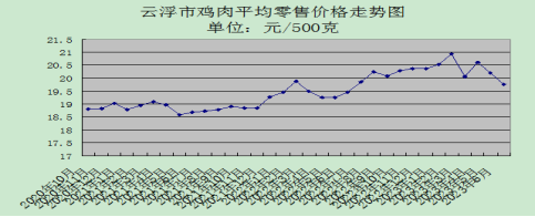 6月份,我市鸡肉市场供应充足,价格小幅下行。鸡肉市场零售均价每500克为19.75元,环比下降2.23%,同比上升1.49%。