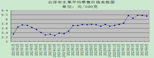 6月份,我市水果供应充足,价格微幅有降。监测的6种主要水果零售均价每500克为6.15元,环比微降0.49%,同比上升6.40%,其中,苹果下降2.44%,香蕉下降4.21%。
