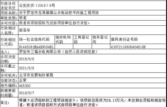关于罗定市龙湾镇旗山水电站技术改造工程项目的核准