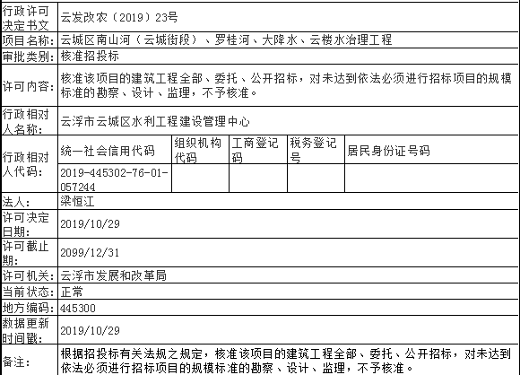 关于云城区南山河(云城街段)、罗桂河、大降水、云楼水治理工程的招投标核准