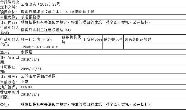 关于郁南县建城河(黄龙水)中小河流治理工程的招投标核准