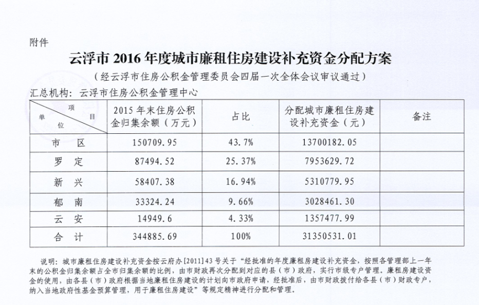 云浮市2016年度城市廉租住房建设补充资金分配方案