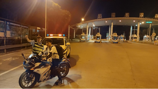 10月1日20时左右,执法人员巡查至G80广昆高速公路云安收费站出口附近路段,发现应急车道停着一辆开着双闪的摩托车。摩托车驾驶员待在原地不知所措。执法人员前往询问得知其摩托车没油无法行驶。执法人员为摩托车驾驶员开出一条安全通道,并驾驶执法车在后方安全警戒,将摩托车驾驶员护送至收费站外加油。