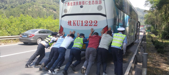 10月7日上午11时许,一辆大客车在G80广州方向石牙山隧道口附近发生机件故障,停靠路肩。云浮交通执法人员迅速联合公安、路政人员指挥交通、维持秩序、协助推车、安抚乘客,帮助车辆修复后正常行驶。