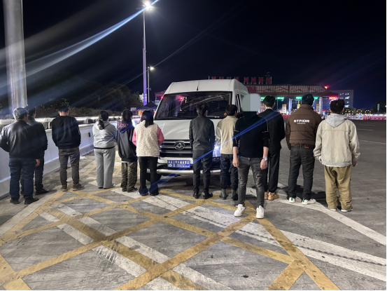 2025年1月4日晚,云浮市交通运输局执法二支队联合交警部门在广昆高速云浮东收费站开展联合执法行动,一辆未悬挂车牌的中型客车驶出收费站,执法人员遂示意其靠边停车接受检查,执法人员上前出示证件、表明身份后,对司乘人员进行询问调查。