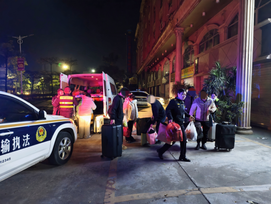 在完成调查取证工作之后,由于已近深夜合规长途车辆没有班次,为了确保乘客安全,根据他们的意愿,执法人员采取了一系列细致周到的服务,使用执法车辆,安全、有序地将乘客护送至邻近的住宿酒店,在这一过程中,执法人员协助乘客搬运行李。